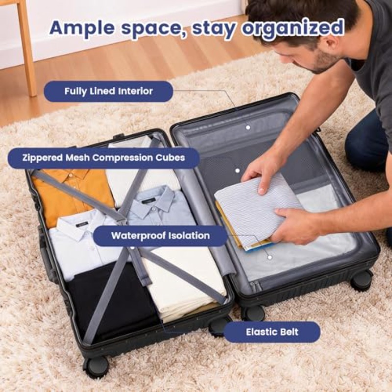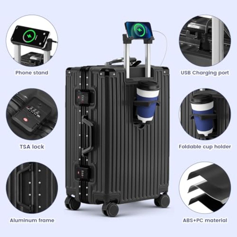 24-Inch Zipperless Carry-On Suitcase with an Aluminum Frame, Hard Shell, Tsa-Approved Lock, Spinner Wheels, Phone Holder, Charging Port, And Cup Holder, Designed for Lightweight Travel in Black